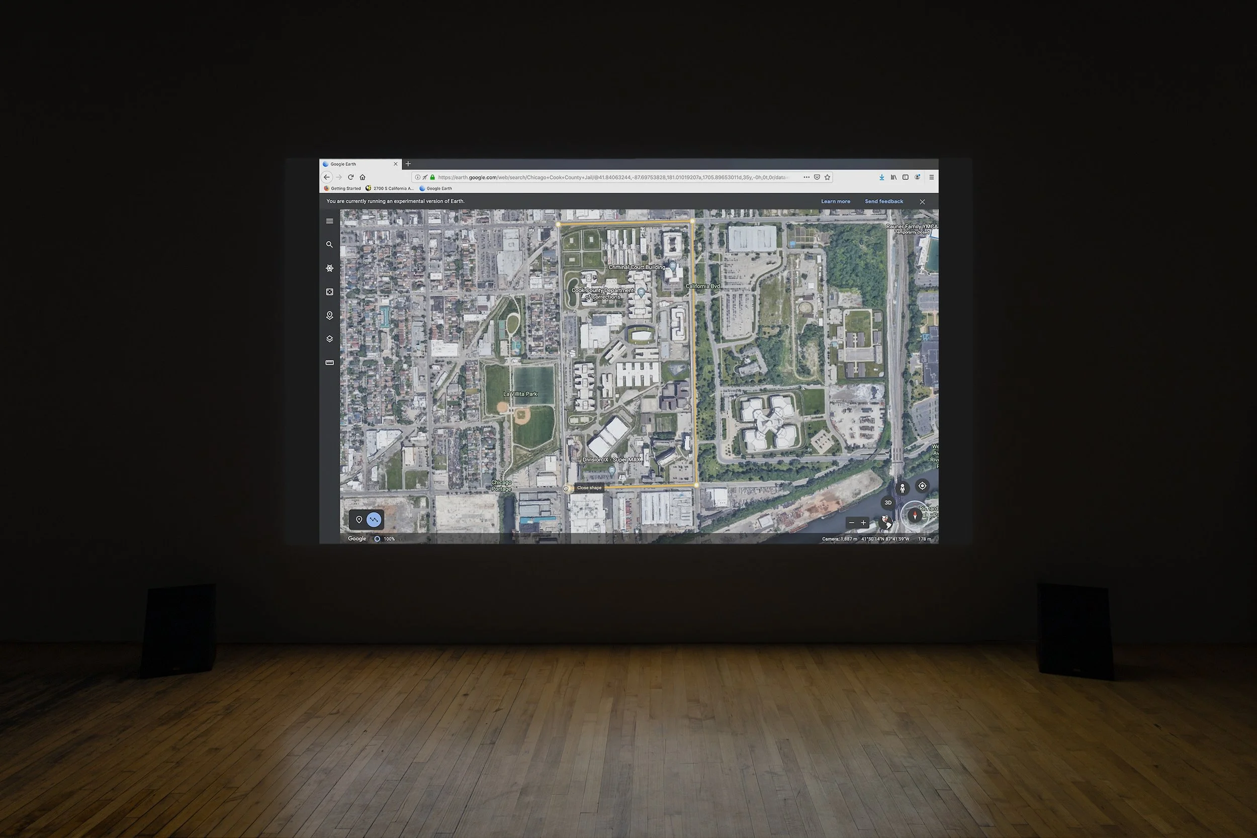Christopher Harris begins his vertiginous Google Earth expedition of Chicago at the Cook County Department of Corrections, the nation’s third largest jail system. From this haunting aerial view of the city, Harris traces a path directed by the video’s frenzied, layered soundtrack of police radio chatter recorded during the fervent citywide protests of 2020. The camera then drops to street level and speeds through parts of downtown before returning to the jail, merging this complex and the surrounding city into a continuous carceral landscape.