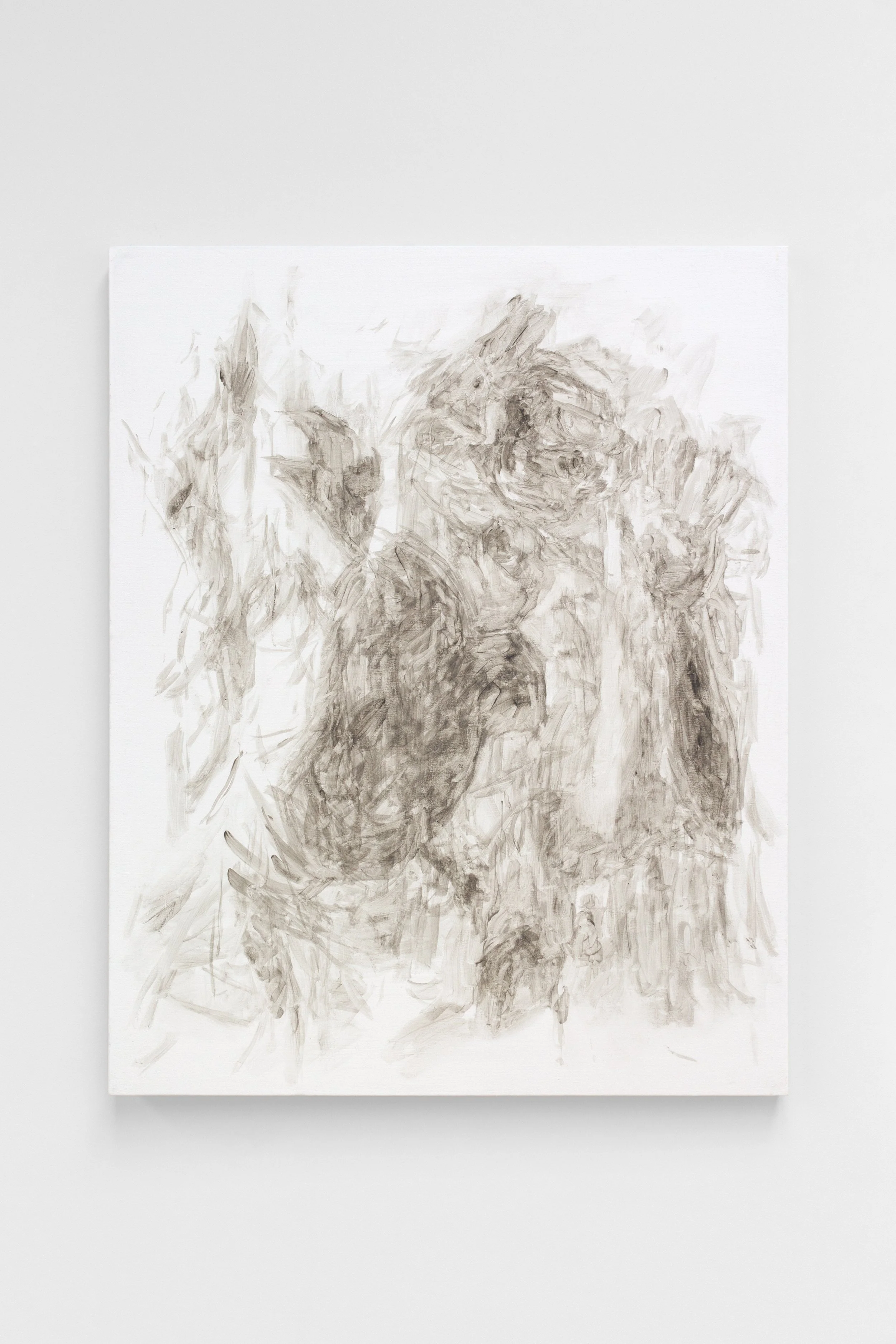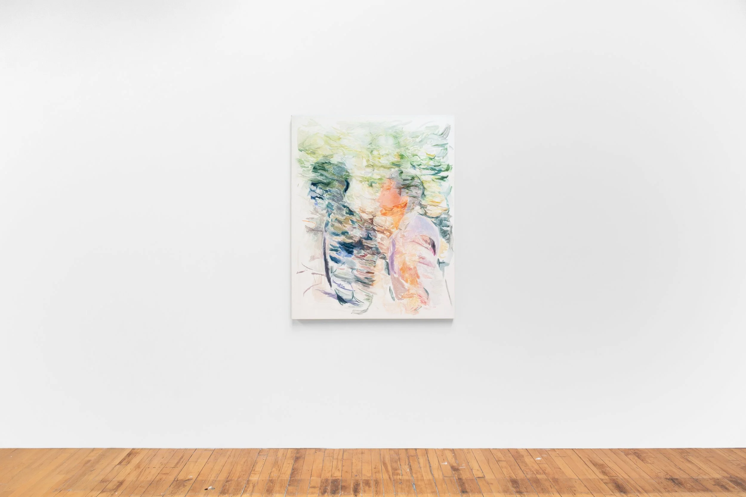 Mullins creates depth through a particulated, multi-layered surface. He paints primarily from reference images, some of which are photos of photos on other screens. The resulting paintings include the distortions within these mediated images, which means counterintuitive marks, like reflections of light from Mullins’s window bouncing off his computer screen and captured by his camera, receive compositional treatment alongside the dappled light and undulating figures in the reference images themselves. Mullins constructs an image and then removes it, adds to it and subtracts from it constantly in an extension of void and atom—a space and a body connected through the boundless ability to move and create in all directions.