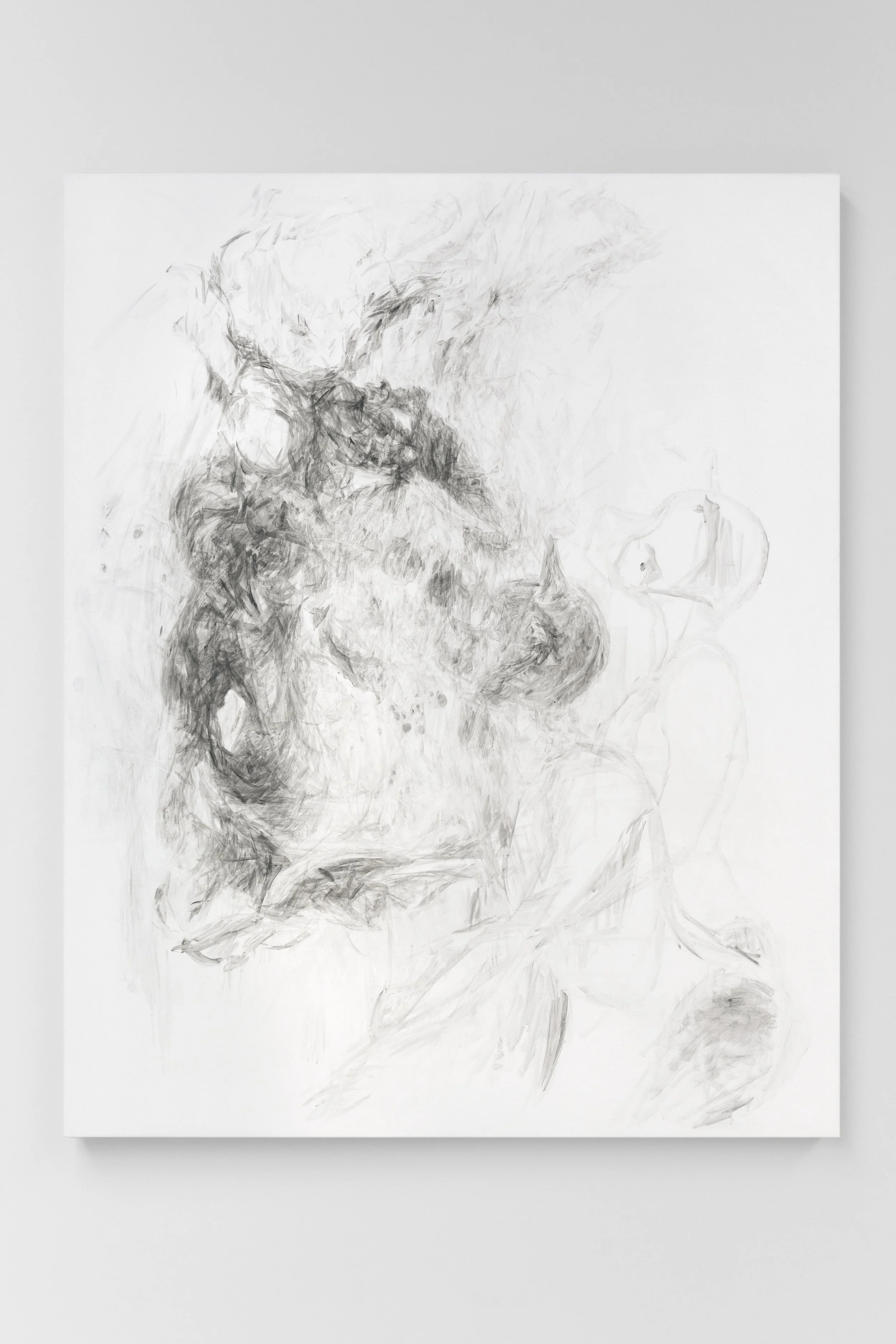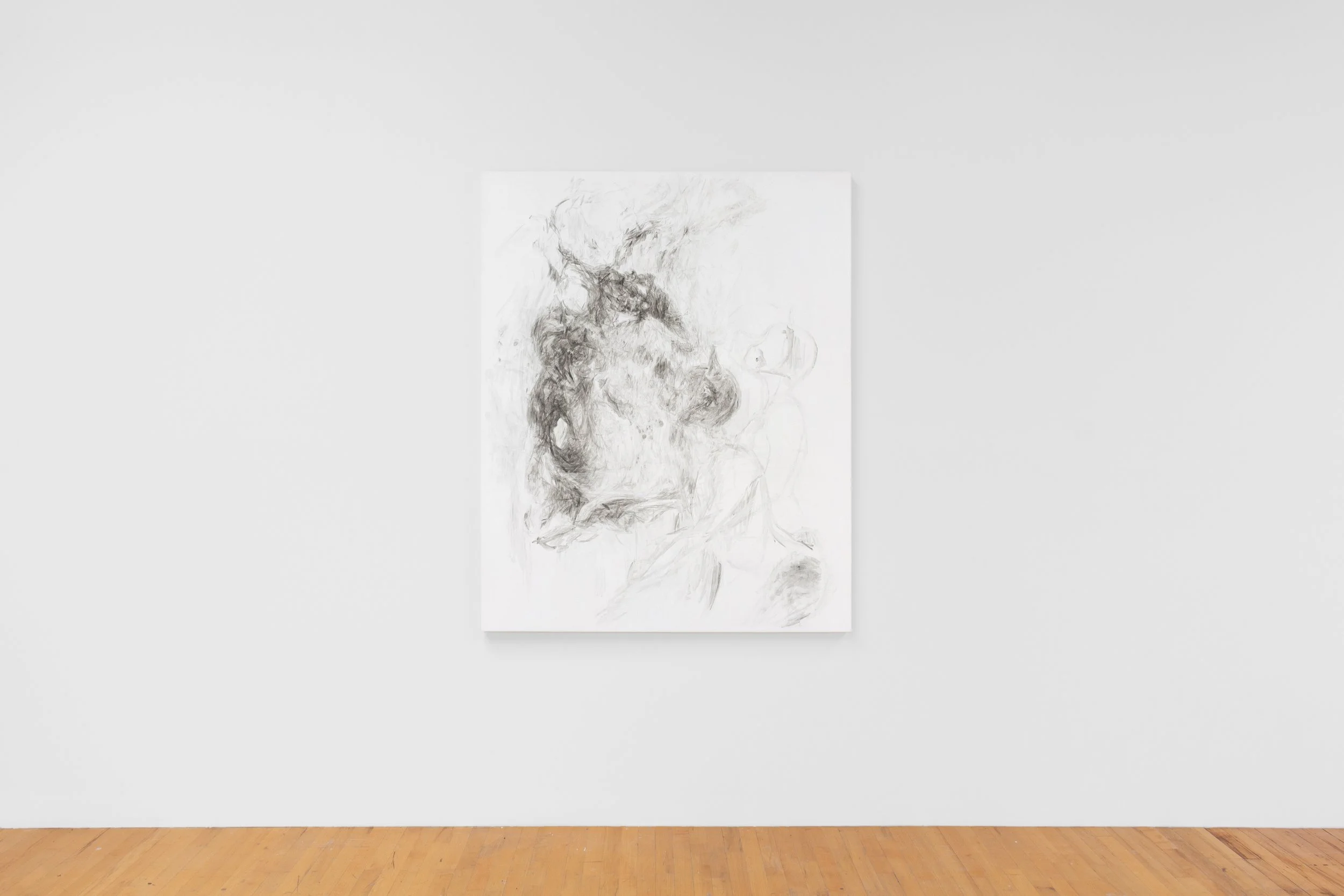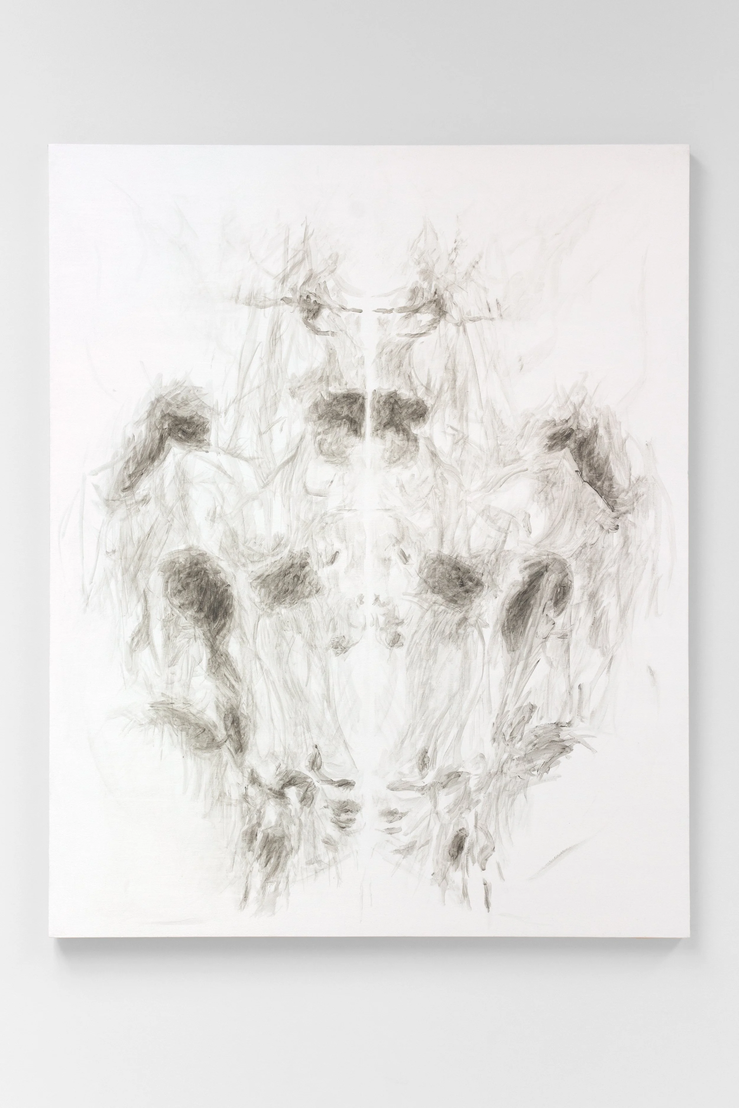 Surface play reaches its pinnacle in two Cloud paintings, a name that continues the particular panorama of Mullins’s show. Produced as charcoal body prints on vellum, then photographed, and finally rendered in paint, the pictorial plane twists and becomes a ground, privileging an indexical form over illusionistic space. Most clearly in Narcissus after Caravaggio (Cloud), the displaced body, mirrored on one half of the image, becomes an instrument of the possibility of form. Through highly expressive means, the Cloud works enact the impression of a physicalized consciousness conveyed in the Swerve paintings. Mullins, in using his own body to create the initial prints, engages with a localized impact that conflates body and surface. Through collision, nature shapes itself.